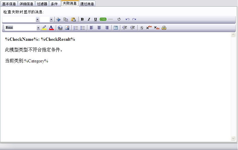 Model Review 中的“失败消息”选项卡用于控制在运行检查但不符合给定条件后将显示在“结果浏览器”中的消息: