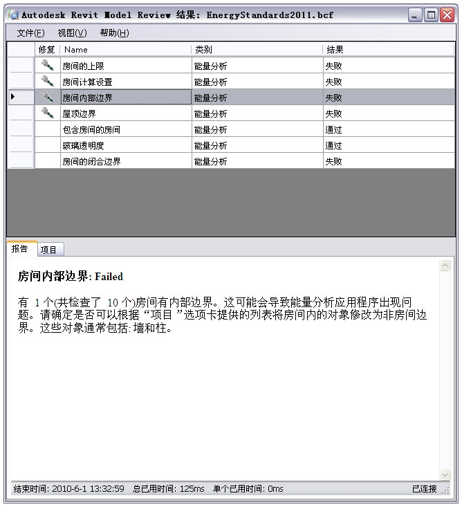 “项目”选项卡提供有关检查结果的更具体的信息。 通过它可以从列表中选择一个项目,并使用 Revit 找到针对问题根源进行调整/编辑可使用的最佳视图,以便进行查阅或手动更正。