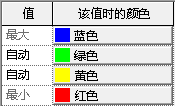 当向默认的最大和最小设置添加新的值颜色对时,自动指定的颜色处于其上和其下颜色的中间(使用 RGB 线性提供)。与“自动”值对应的精确编号根据分析结果而变化,如下表所示: