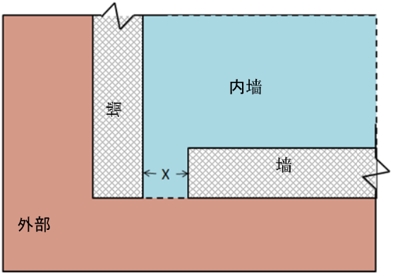 具有尺寸为 X 的间隙的两面墙之间构成内部空间的平面视图