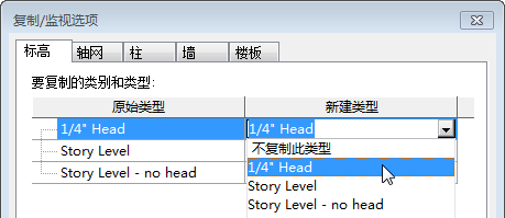 | 防止 Revit 复制某一类型的图元 | 在“原始类型”列中找到该图元类型。 在同一行的“新建类型”列上,选择“不复制此类型”。 |