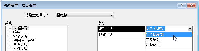 在将链接模型中的装置复制到 MEP 项目时或在此之前,在指定协调设置对话框中为每个装置类别指定复制行为。