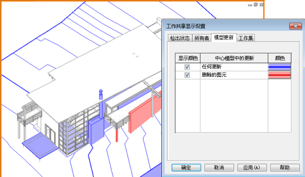 您可以直观地区分工作共享模型中的哪些图元已在中心模型中更新或者从中心模型中删除。