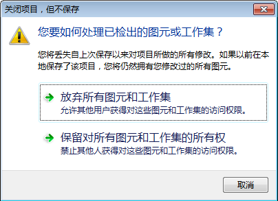 该选项会放弃您对本地模型所做的任何修改。 这对于您上次保存到本地模型的修改没有任何影响。 该选项将本地模型回退到上次保存时的状态,并显示“关闭项目,但不保存”对话框。