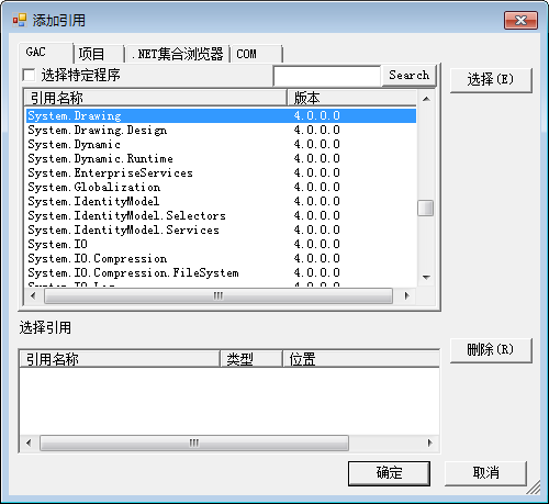 在“添加引用”对话框中,在列表中找到并选择 System.Drawing 和 System.Windows.Forms。 按住 Ctrl 键可进行多选操作。 例如: