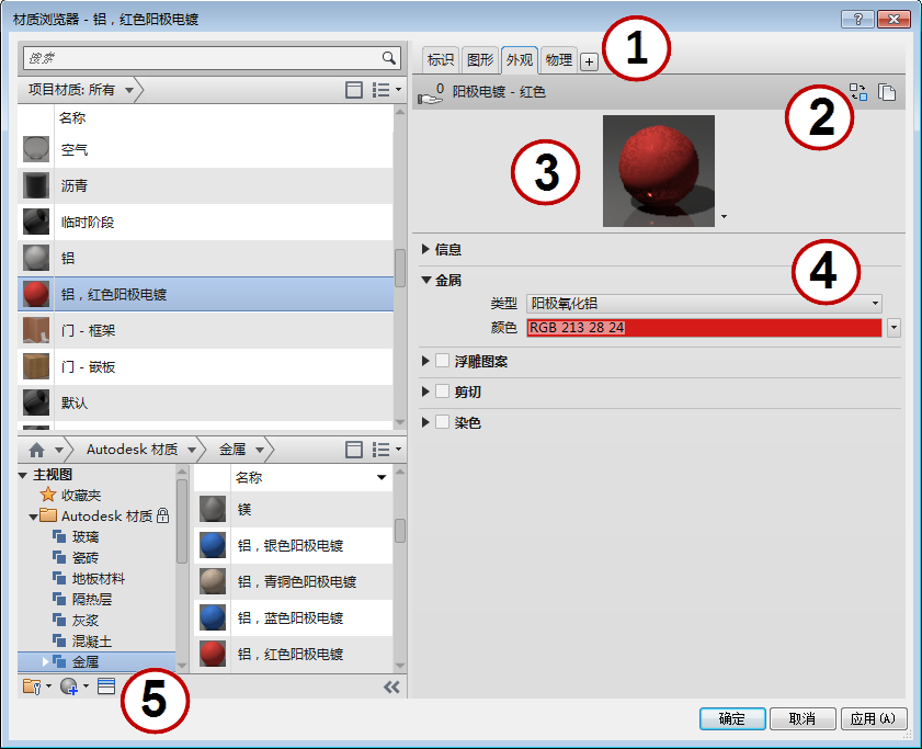4 | “特性”面板:用于显示和管理选定资源的详细特性。 资源名称和说明都显示在“信息”下拉面板下面。 上面的示例显示的是“阳极电镀 - 红色”外观资源对应的“金属”特性(已展开)。 |