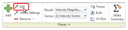 5. The colors are nice, but we need vectors to really understand the flow! To show vectors, click Results (tab) > Results Tasks (panel) > Planes, and click Edit from the Planes context menu: