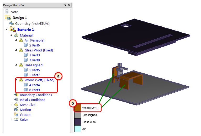 a. On the Design Study bar, confirm the material assignment for the Wood (Soft) parts..