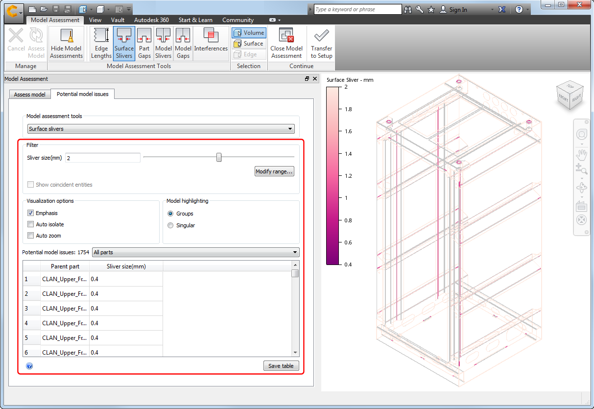 Use the filter settings to isolate objects of potential concern. Use the slider bar to vary the maximum object size - any object smaller than the slider bar value is included as a potential issue. You can also direct-key information into the slider size box, or use Modify range to specify a range of interest of object size. As change the filter, watch the number of Potential model issues vary.