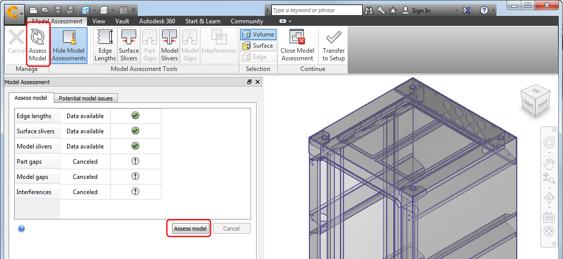 When you enter the MAT environment, your CAD model opens with the MAT stepping through the various analyses and the Model Assessment tab active. Your browser shows the progress of each analysis on the Assess Model tab - green checkmarks appear when the respective analysis is complete. Until all analyses are complete, you can cancel the ongoing and queued operations by clicking Cancel.