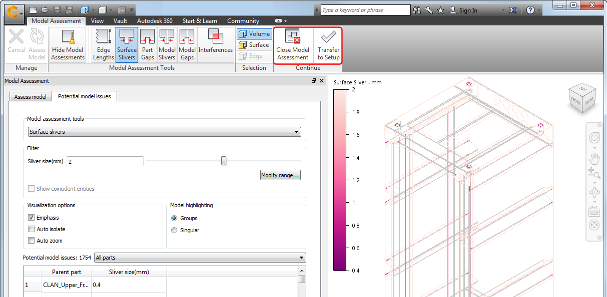 You use three of the assessment tools, Edge Lengths, Surface Slivers, and Part Gaps, to assess your model for part issues. Use the other three commands, Model Slivers, Model Gaps, and Interferences, to assess for assembly issues.