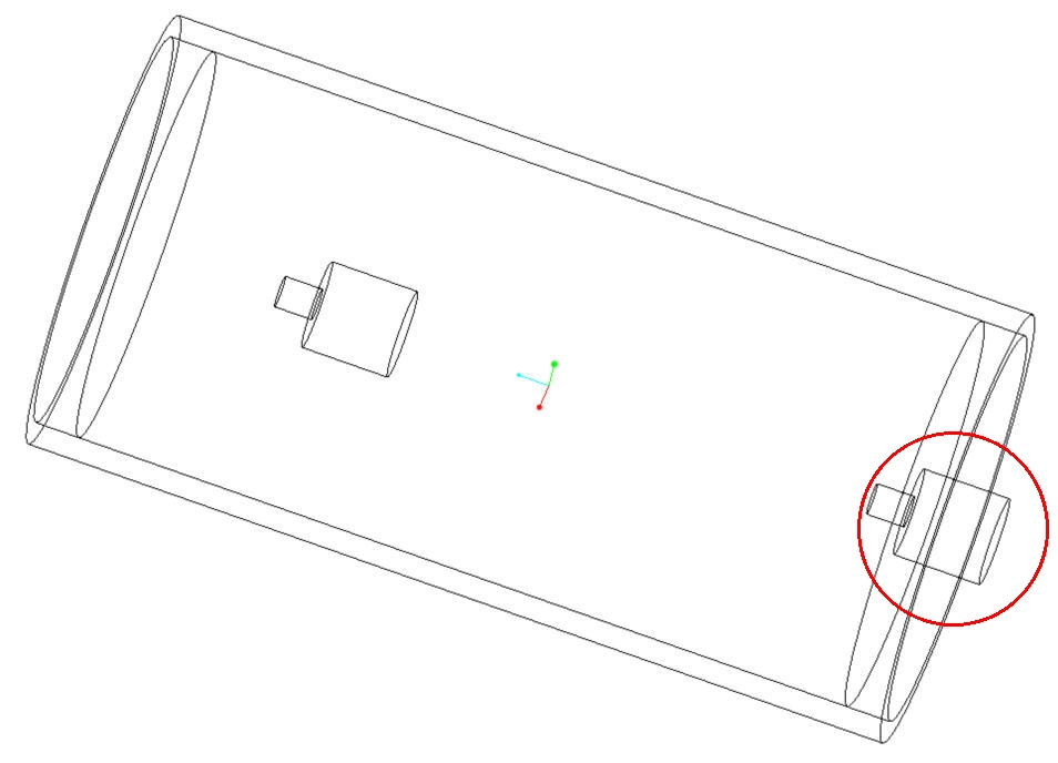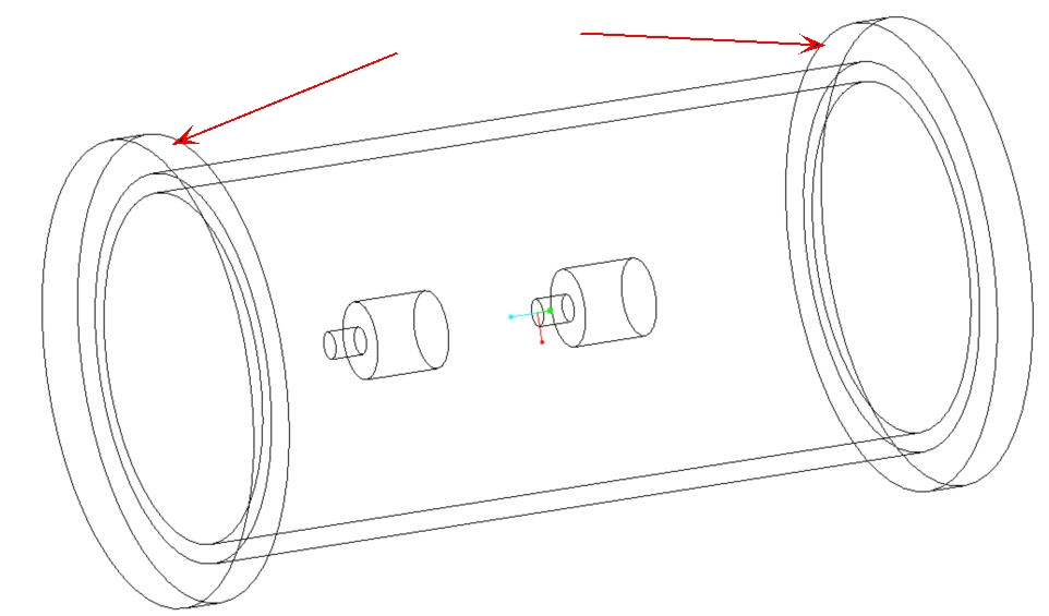 The Pro/Engineer geometry shown above consists of five parts: the pipe wall, the two internal components, and the two end caps. In this example, the caps are constructed using the inner diameter of the pipe wall, and extruded into the pipe. Alternatively, the caps could have been extruded out of the pipe, or have been built using the outer diameter of the pipe wall.