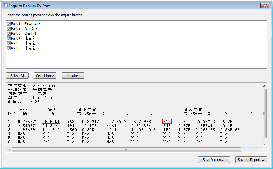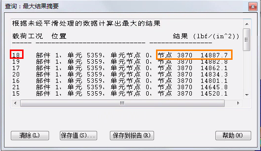 - 记下位于结果列表首行的载荷工况编号,这是发生最大未平滑应力的时间。