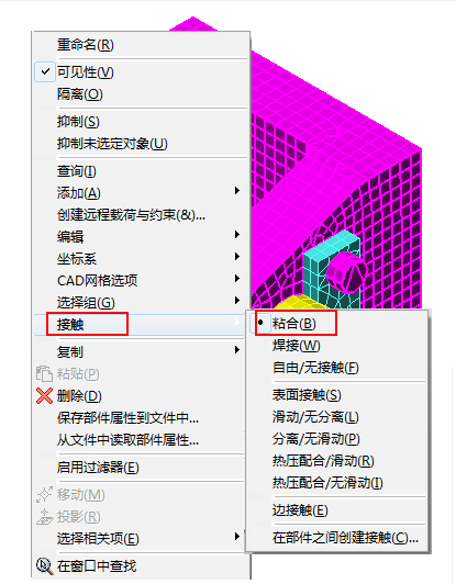 在此步骤中,我们将默认接触更改为“表面接触”。然后,在螺钉与连接叉以及螺钉与护圈之间指定“粘合”接触。这将确保装配件中的所有部件之间存在一组真实的接触。