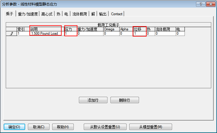 注: “压力”乘子控制所有表面压力和力载荷。默认情况下,此乘子为 1。“位移”乘子控制规定位移载荷。由于此类载荷尚未应用于模型,因此该乘子不会影响结果。