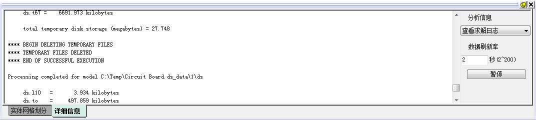 - 首次运行分析时,会在每个部件的内部生成实体网格。完成实体网格划分之后,求解将开始。在求解过程中,求解器日志将显示在“输出栏”(位于 Simulation Mechanical 窗口底部)的“详细信息”选项卡中: