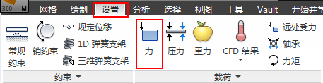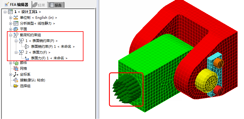 在此步骤中,我们将向杆销眼指定销约束和 1500 磅的力,以使杆销眼处于拉伸状态。