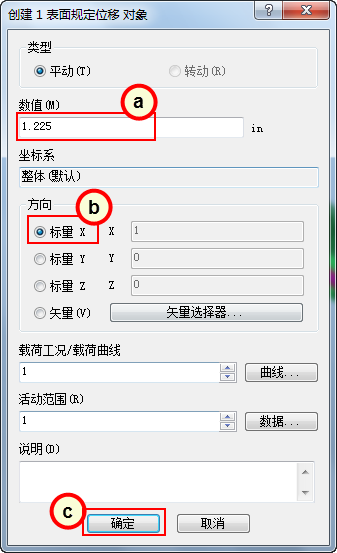 。在 1 秒的时间跨度里,此分析的载荷时间定义将乘子从 0 变为 1。默认曲线定义已足够,因此无需更改。
