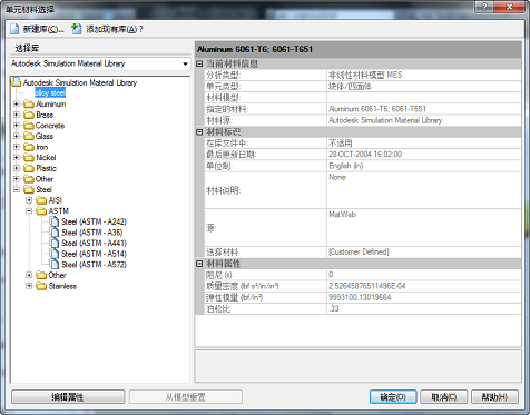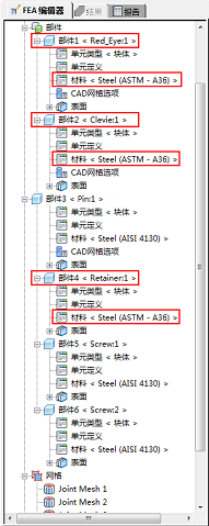 在此步骤中,我们将为杆销眼、连接叉和护圈部件指定 ASTM A36 钢。