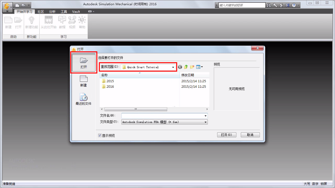 - 启动 Simulation Mechanical。在“打开”对话框中,从左列中单击“打开”,然后浏览至包含弹簧夹装配件的文件夹。(您的文件夹可能与以下所示文件夹不同。)