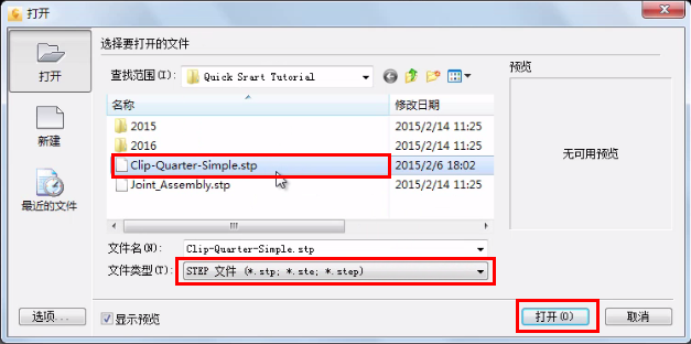- 从“文件类型”菜单中,选择“STEP 文件(*.stp、*.ste、*.step)”。选择 Clip-Quarter-Simple.stp,然后单击“打开”。