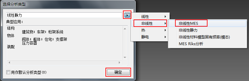 - 单击“选择分析类型”对话框中的箭头,然后选择“非线性”和“非线性材料模型 MES”。然后单击“确定”。