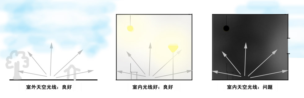 尽管因太阳引起的直接照亮地板上灯光池的最终聚集射线将确实看到高对比度。