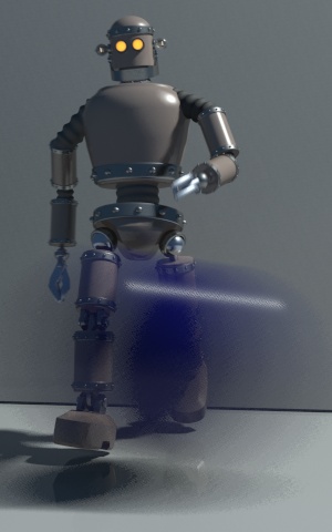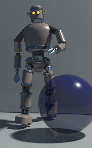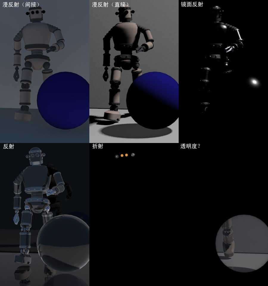 在示例场景中使用几个图层,我们会在不透明的机器人前放置一个简单透明球体。在此情况下,透明度在概念上表示薄玻璃球体,而不是实心玻璃球体,从而能够通过一个镜面反射透射组件更好地实现这种透明度。