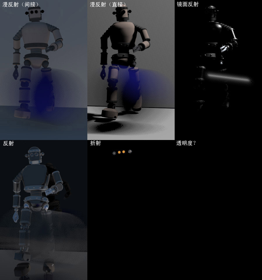 我们的“透明度”输出为“L *<TS> E”,也可以来自镜面反射透射。也可以单独输出通过透明度从眼睛得到的漫反射、光泽和镜面反射交互。合成器可能会将各种子输出视为准备添加到眼睛直接看到(不是通过透明对象)的各个输出中。