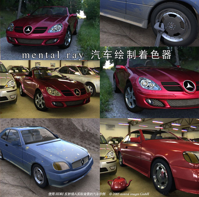 mi_metallic_paint 是用于进行金属颜色渲染的着色器。但是,它仅针对颜料和油漆碎片,对透明涂层反射来说并不是很重要。要完成完整效果,它需要组合使用反射着色器(即将其连接到 mib_glossy_reflection)的 base_material 参数)。对于油漆碎片,同时还需要凹凸着色器(通常为 mi_bump_flakes)。