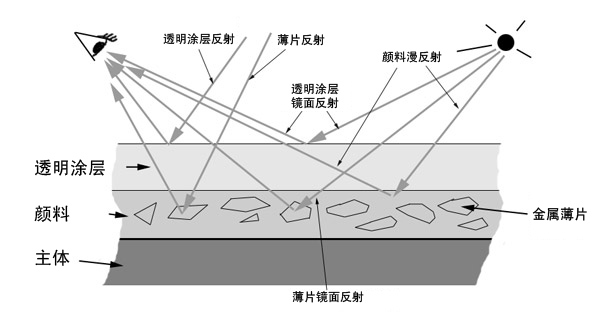 汽车绘制具有多个特殊特性。汽车车身顶部是颜料的薄层。此层的属性是:感觉到的实际颜色会根据查看角度和引入灯光的入射角度而发生色移。