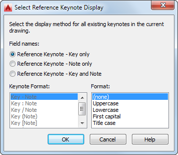 In the Select Reference Keynote Display or Select Sheet Keynote Display dialog box, select an option for Field names. If you select the Key and Note option, you can also select an option for Keynote Formats. You can change the Format setting regardless of the Field name selection.