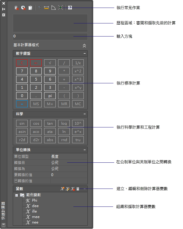 「快速計算器」除了科學計算器的基本功能之外,還包含幾何函數、單位換算和變數的功能。