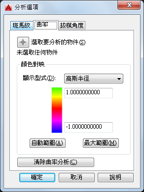 計算選用於進行曲率分析的所有物件最大和最小範圍 。(VSACURVATUREHIGH 和 VSACURVATURELOW 系統變數)