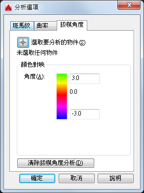 將綠色對映至最大拔模角度,紅色對映至中拔模角度,藍色對映至最小拔模角度。