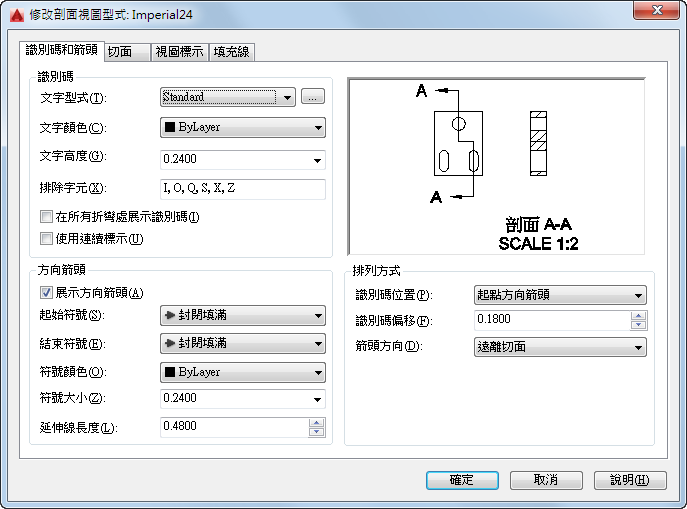 「識別碼和箭頭」頁籤 (剖面視圖型式管理員)