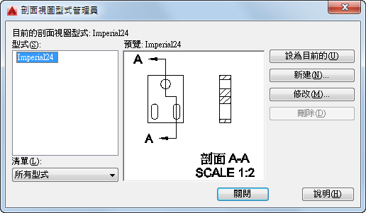 將在「型式」清單中所選的剖面視圖型式設定為目前型式。所有新剖面視圖都是使用此剖面視圖型式所建立。