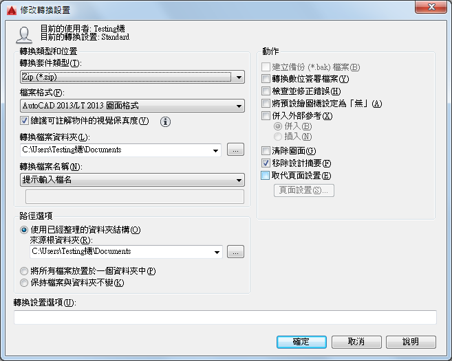 輸入轉換設置的描述。此描述顯示在轉換檔案設置清單下的「DWG 轉換」對話方塊和「轉換設置」對話方塊中。您可以在清單中選取任何轉換設置,以顯示其描述。