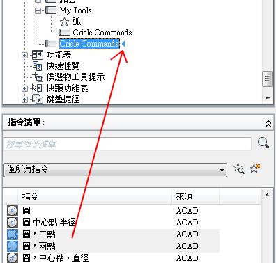 在「指令清單」窗格中,將要加入的指令拖曳至「<