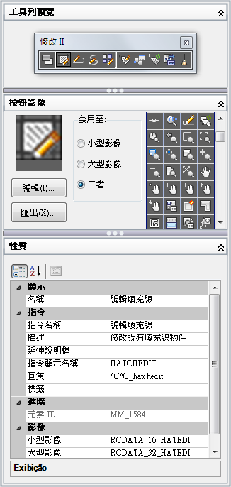「動態顯示」窗格顯示在「自訂位置」窗格選取的使用者介面元素預覽。它可讓您編輯在「指令清單」窗格中選取的指令影像,以及在「自訂位置」或「指令清單」窗格中選取之項目所特定的性質。