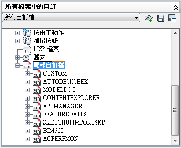樹狀檢視用於建立並管理使用者介面元素。在建立使用者介面元素之後,您就可以將指令從「指令清單」窗格拖曳至元素中,以加入該指令。您也可以在樹狀檢視中向上和向下拖曳指令,以變更其在功能區面板或工具列等使用者介面元素的顯示順序。
