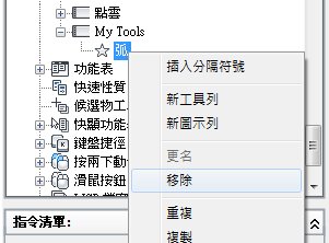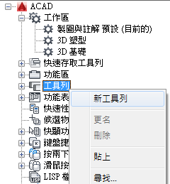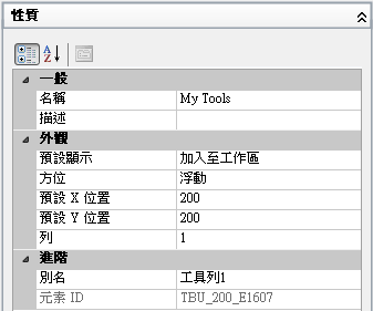 新工具列 (被命名為「工具列1」) 會置於「工具列」樹的底部。