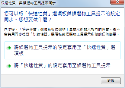 3. 按一下「將快速性質設定套用至候選物工具提示」。