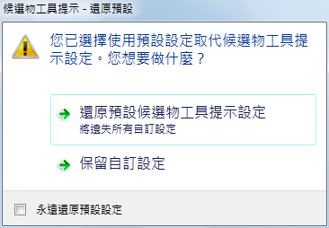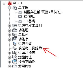 1. 在「自訂」頁籤的「<檔名> 中的自訂」窗格中,於「候選物工具提示」上按一下右鍵。