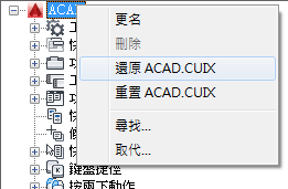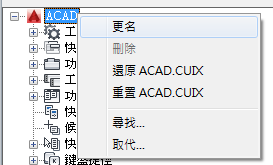註: 在重置時,只有在程式安裝位置下方 UserDataCache 資料夾中找到的 CUIx 檔中可進行重置。