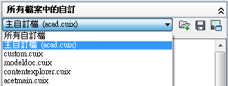 - 在「自訂」頁籤的「<檔名> 中的自訂」窗格中,從下拉式清單中選取一個 CUIx 檔。