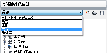 建立的所有新指令均被直接加入工作 CUIx 檔。如果未載入您要使用的 CUIx 檔,請從自訂檔下拉式清單中選取「開啟」。然後瀏覽並選取您要使用的 CUIx 檔。