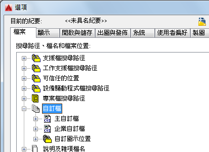 - 在「選項」對話方塊的「檔案」頁籤中,按一下「自訂檔」旁的加號 (+),以展開節點。