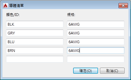按一下以開啟「導體清單」對話方塊,您可在其中加入導體和定義每個導體的顏色和規徑。