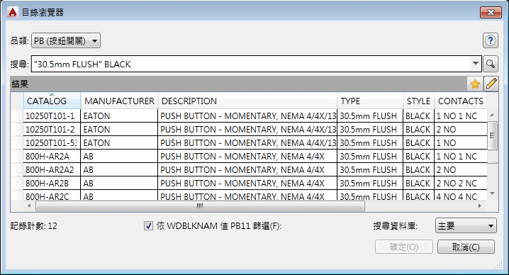 註: 子配件項目 (由「配件清單」值定義) 不會包括在搜尋結果中。使用「目錄瀏覽器」的編輯模式,可檢視和編輯子配件項目。